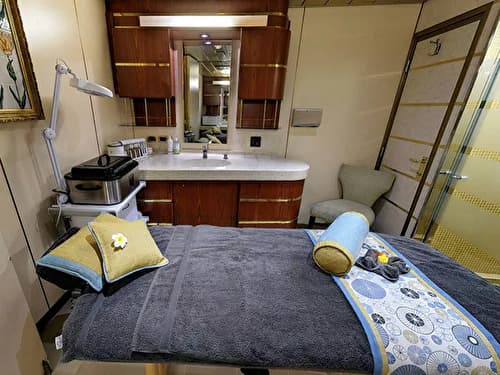 The Terrace Cabins can be found on Deck 3, midship and are approximately 218 square feet. The bedroom features two single beds which can be converted into a queen-size bed. The bathroom has a shower. Sliding glass doors lead onto the walk-around Lower Promenade Deck.