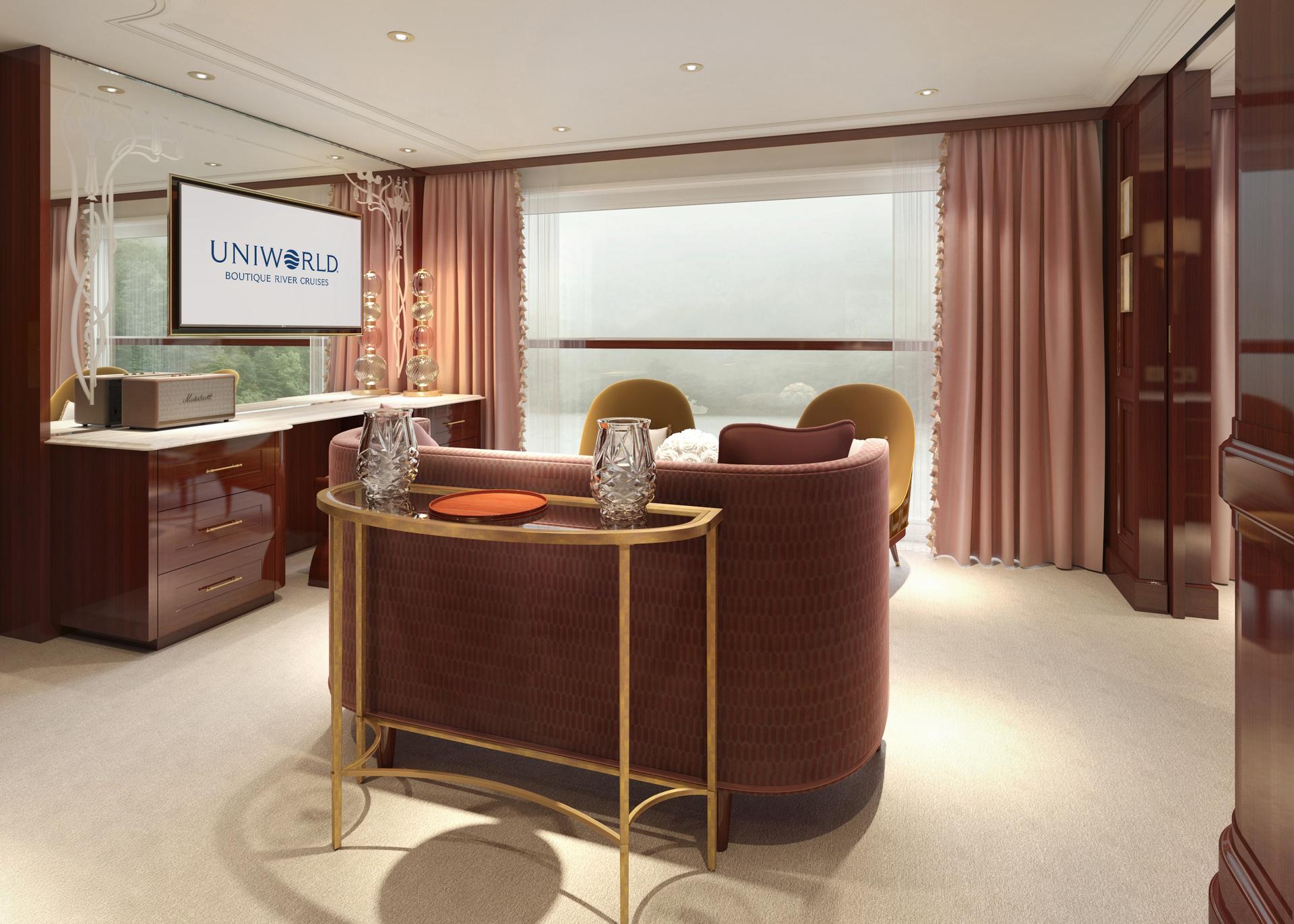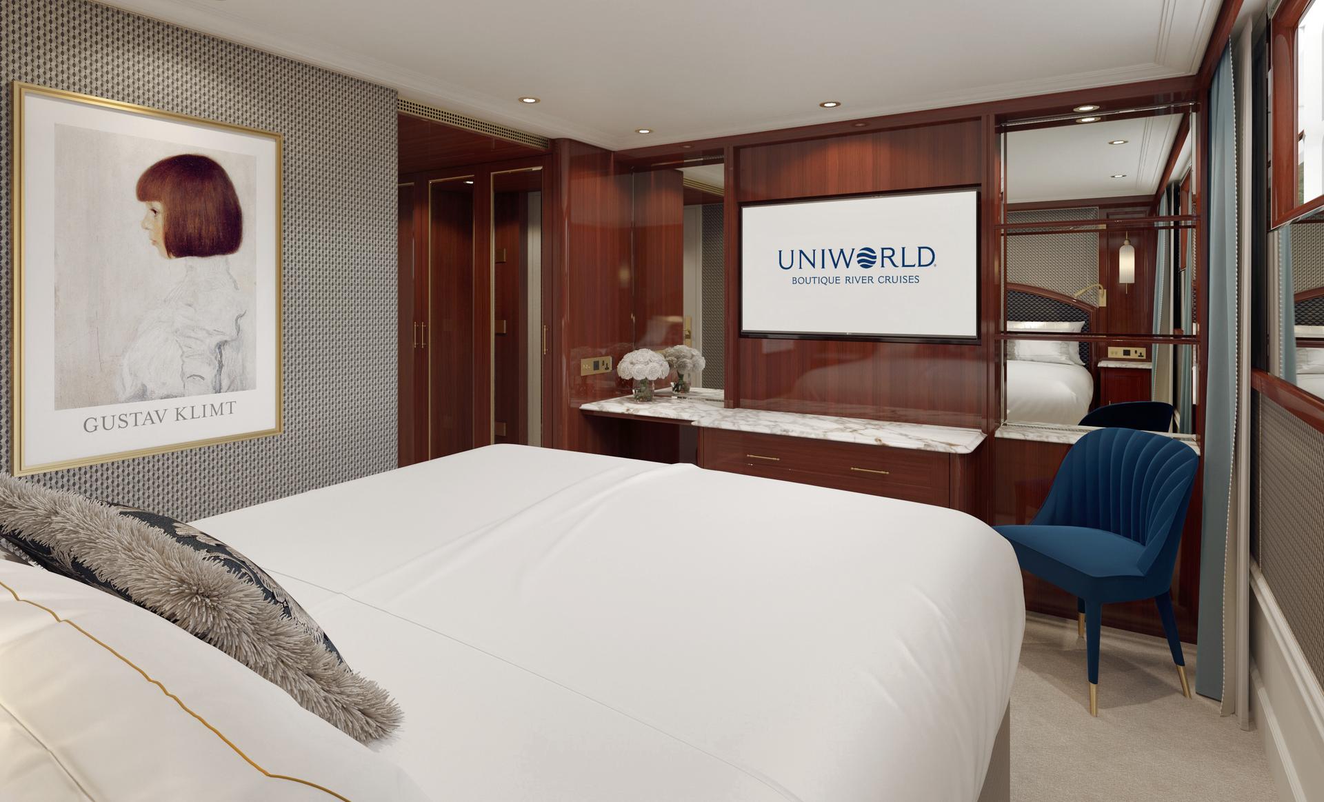 Sailing the Danube River, the next member of our Super ShipTM fleet will be inspired by master Viennese painter Gustav Klimt. In his honor, we’re naming the vessel after his beloved muse, Emilie Flöge. When she debuts in 2026, the S.S. Emilie will bring elements of Klimt’s signature style to our guests, with dramatic hues, Art Nouveau elements, and stunning pops of gold. Guests who book a Grand Suite and the adjoining Deluxe French Balcony next door can see their stateroom transformed into an incredibly spacious 2-bedroom suite.