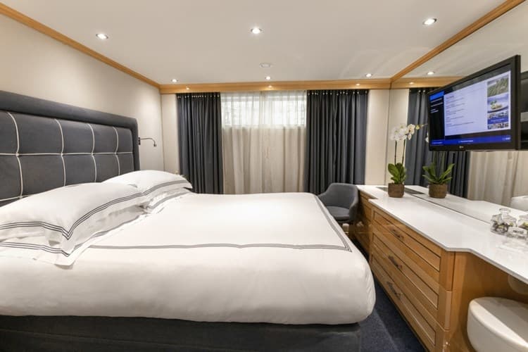 Luxurious riverview stateroom (150 sq ft – 14 sq m) Handcrafted Savoir Beds of England, built-in closets, hair dryer, safe, individual climate-controlled thermostat, direct-dial telephone, and flat-screen TV with infotainment centre, mineral water Marble bathroom with Asprey bath and body products, plush towels, backlit magnifying mirror, cosy bathrobes and slippers.