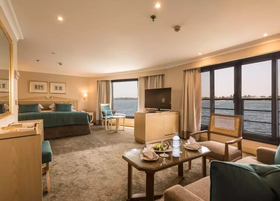 A voyage on this spacious 236ft ship combines comfort and luxury with Egypt’s fascinating ancient history. With a guest list of 104 guests, the atmosphere on board is friendly and intimate – and with an excellent crew-to-guest ratio, you know you’ll enjoy impeccable service on board. Life while sailing on the Nile is slow and relaxing. During the heat of the day, you can cool off in the refreshing pool, put your feet up on the sun loungers, or perhaps pamper yourself with a massage from one of our on-board team. In the evening, head to the bar for cocktails with newfound friends while discussing the mysteries of Ancient Egypt or simply take in the views from the panoramic windows. Complete the experience in our on-board restaurant, where our chefs will introduce you to local flavours as you watch the towns and villages that line the riverbanks glide by. Their carefully curated menus offer an engaging dining experience each night, with a mix of international and Egyptian cuisine. Enjoy a buffet style breakfast and lunch, and buffet or a la carte meals for dinner.
